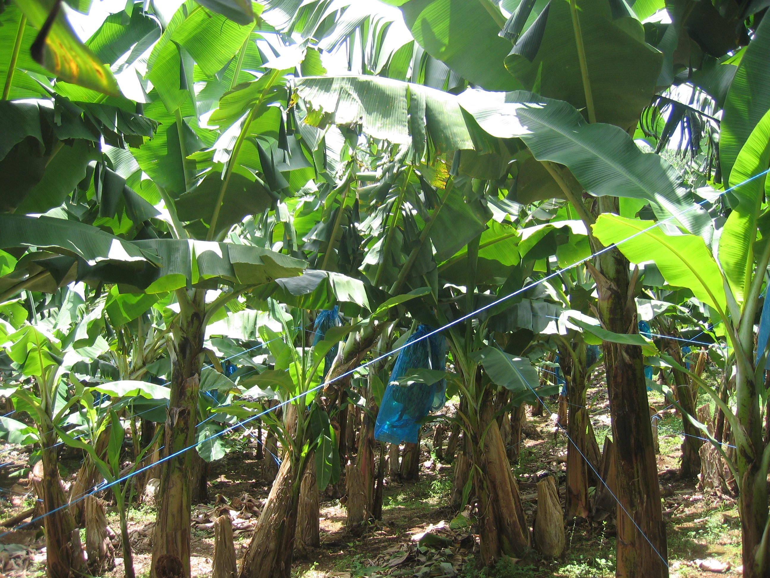 Dans les bananeraies, les régimes de bananes en formation sont protégés par des plastiques