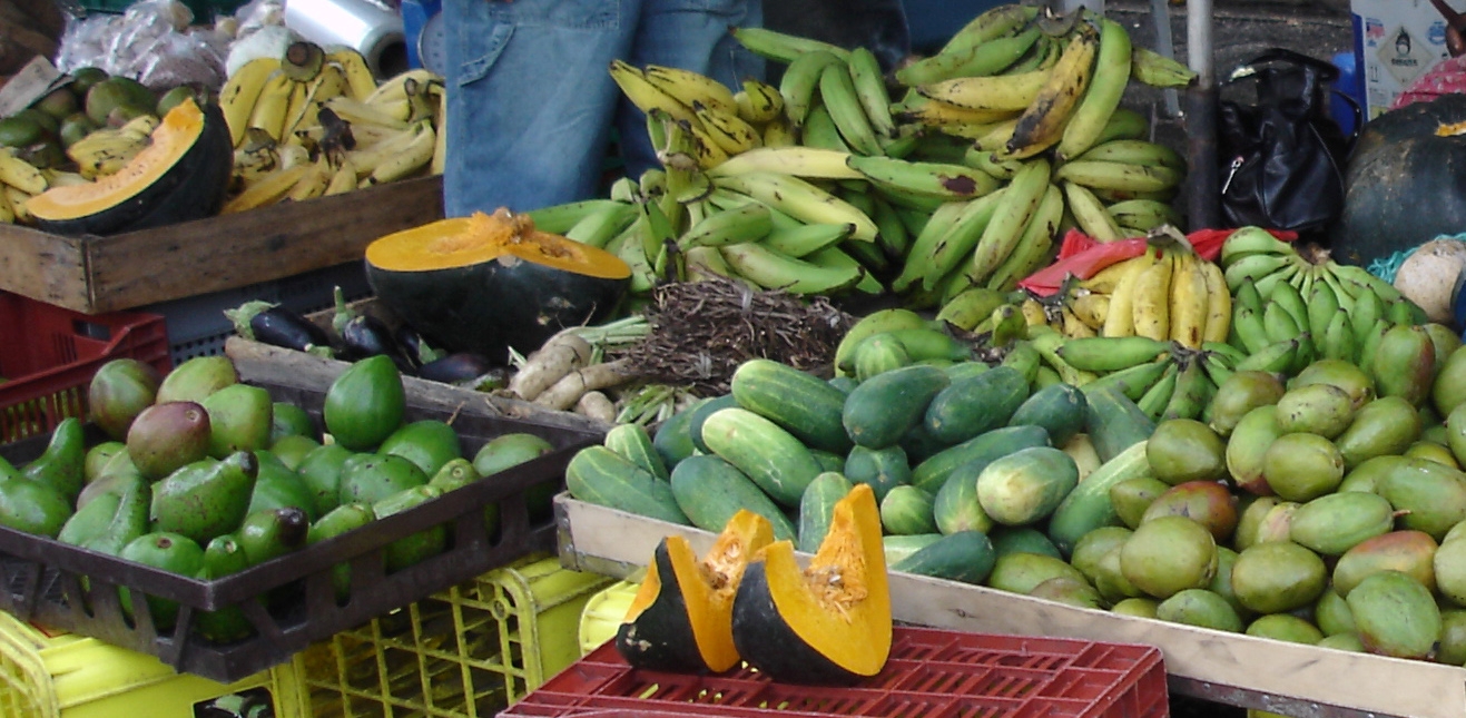Concombres, mangues, avocats, bananes et potiron sur le marché de Fort-de-France
